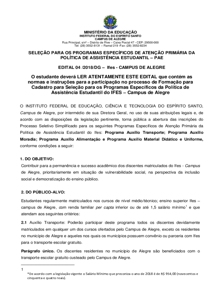 MINISTRY DA EDUC AO INSTITUTE FEDERAL DO ESPRIT SANTA CAMPUS DE ALE GRE RUA Principal, s/n District DE Rive Caixa Postal 47 CEP: 29500000 Tel: (28) 35528131 Rama 219 Fax: (28) 35528234SELEO PARA OS