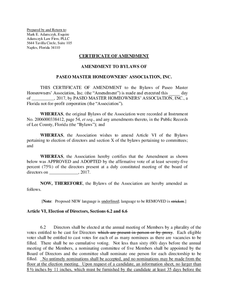 Naples, Florida 34110CERTIFICATE OF AMENDMENT TO BYLAWS OF