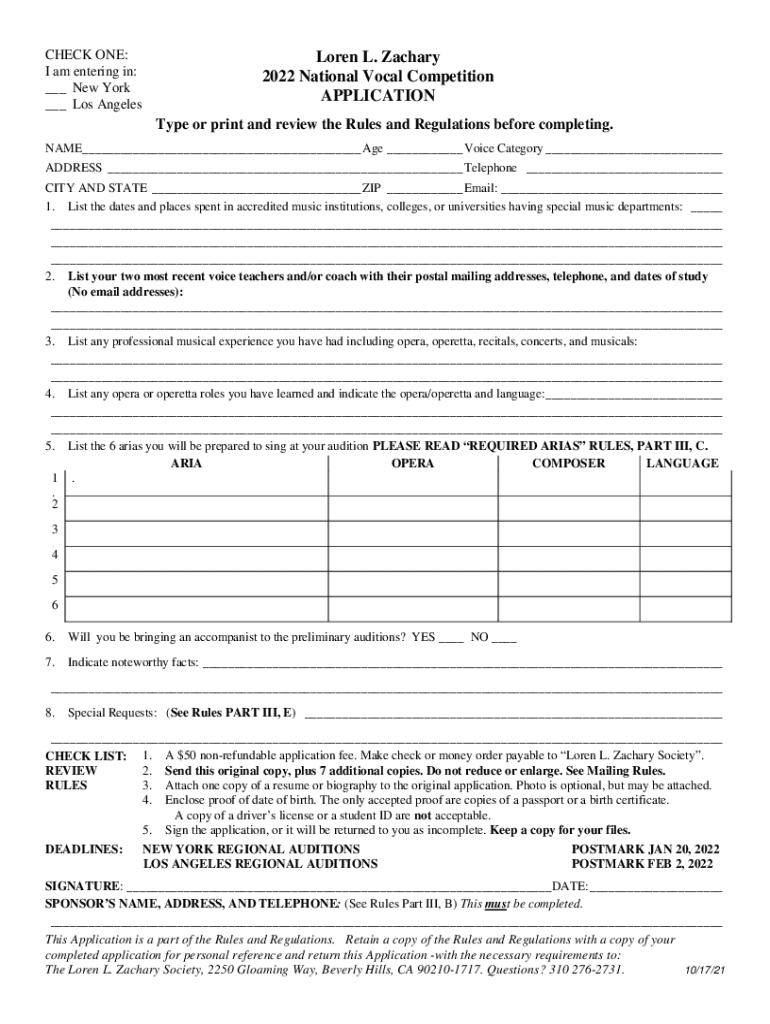 CHECK ONE: I am entering in: ___ New York ___ Los Angeles Loren L. Zachary 2022 National Vocal Competition APPLICATION Type or print and review the Rules and Regulations before completing.NAME___