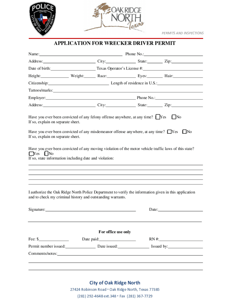 PERMITS AND INSPECTIONSAPPLICATION FOR WRECKER DRIVER PERMIT Name:Phone No.:Address:City:Date of birth:Texas Operators License #:Height:Weight:State:Race:Citizenship:Zip:Eyes:Hair:Length of residence