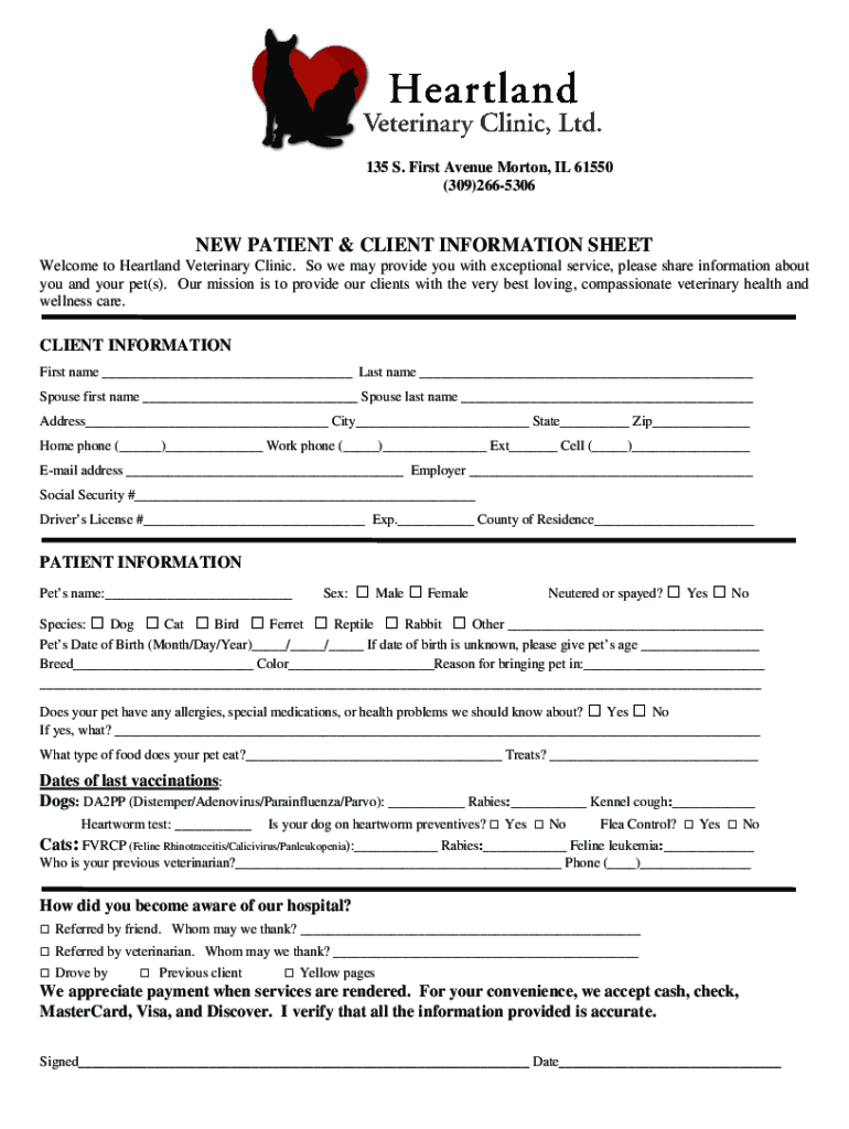 135 S. First Avenue Morton, IL 61550 (309)2665306NEW PATIENT & CLIENT INFORMATION SHEET Welcome to Heartland Veterinary Clinic. So we may provide you with exceptional service, please share information
