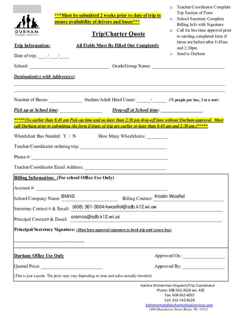 O***Must be submitted 2 weeks prior to date of trip to ensure availability of drivers and buses***trip/Charter Quote Trip Information:all Fields Must Be Filled Out Completely date of trip: ___/___/___Teacher/Coordinator
