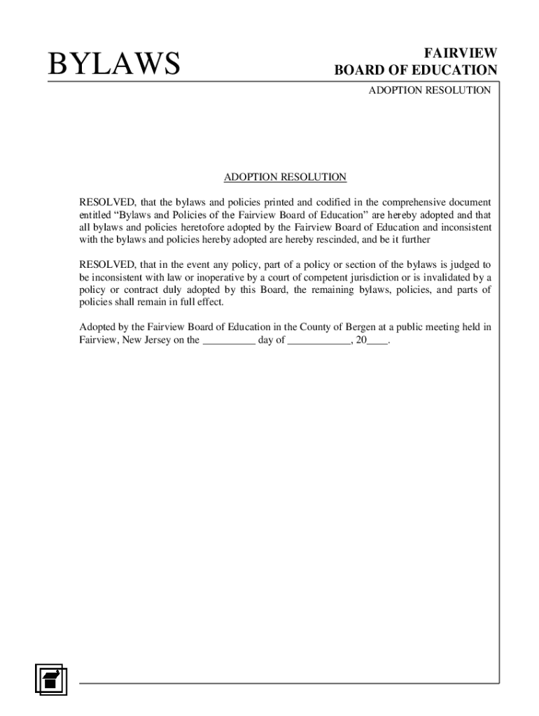 BYLAWSFAIRVIEW BOARD OF EDUCATION ADOPTION RESOLUTIONADOPTION RESOLUTION RESOLVED, that the bylaws and policies printed and codified in the comprehensive document entitled Bylaws and Policies of the