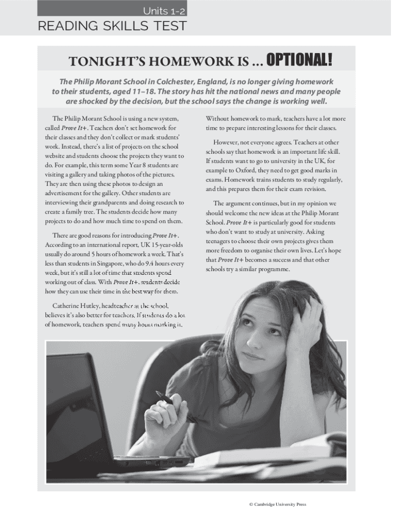 Units 12READING SKILLS TESTTONIGHTS HOMEWORK IS OPTIONAL! The Philip Moran School in Colchester, England, is no longer giving homework to their students, aged 1118. The story has hit the national