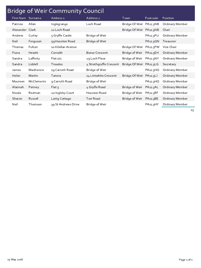 First Nam SurnameAddress 1Address 2TownPatriciaInglegrangeLoch Woodbridge Of Weir PA11 3NBOrdinary MemberBridge Of Weir PA11 3NBChairAllanPostcodePositionAlexander