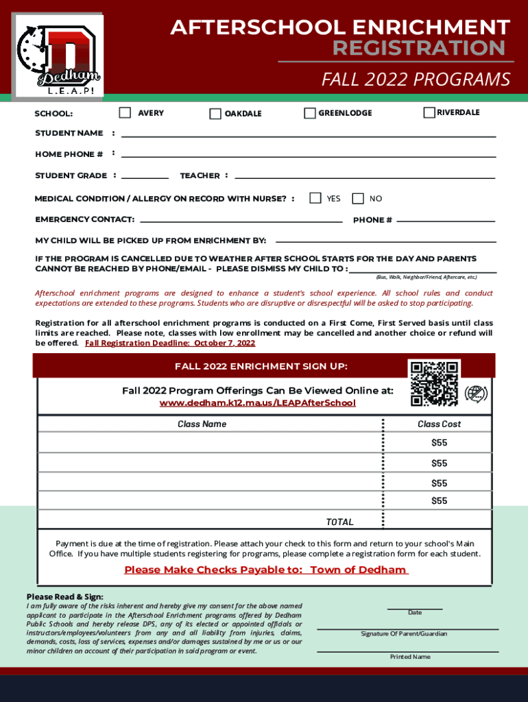 INTERSCHOOL ENRICHMENT REGISTRATION FALL 2022 PROGRAMSAVERYSCHOOL: STUDENT NAME:HOME PHONE #:STUDENT GRADE :OAKDALERIVERDALEGREENLODGETEACHER :MEDICAL CONDITION / ALLERGY ON RECORD WITH NURSE? EMERGENCY
