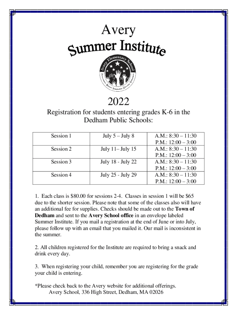 Avery2022 Registration for students entering grades K6 in the Durham Public Schools: Session 1July 5 July 8Session 2July 11 July 15Session 3July 18 July 22Session 4July 25 July 29A. M.: 8:30 11:30