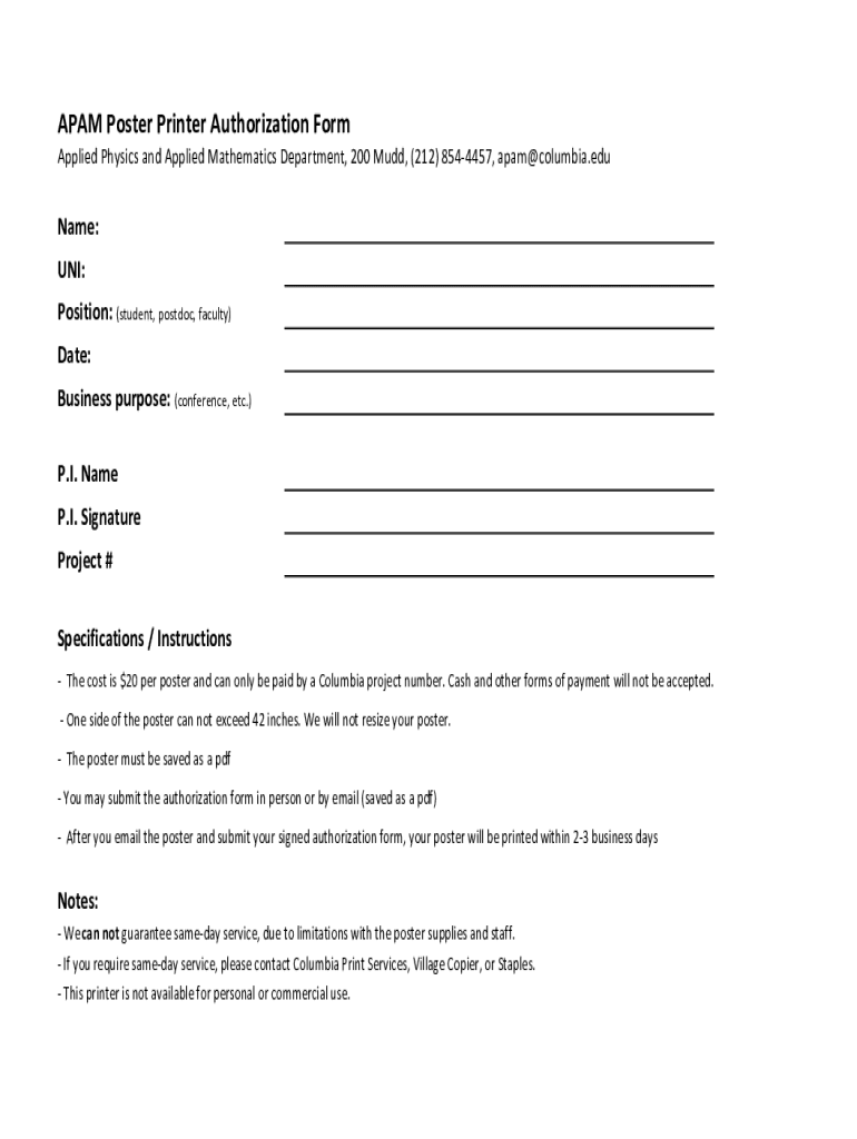 ADAM Poster Printer Authorization Form Applied Physics and Applied Mathematics Department, 200 Mud, (212) 8544457, apam@columbia.eduName: UNI: Position: (student, postdoc, faculty) Date: Business