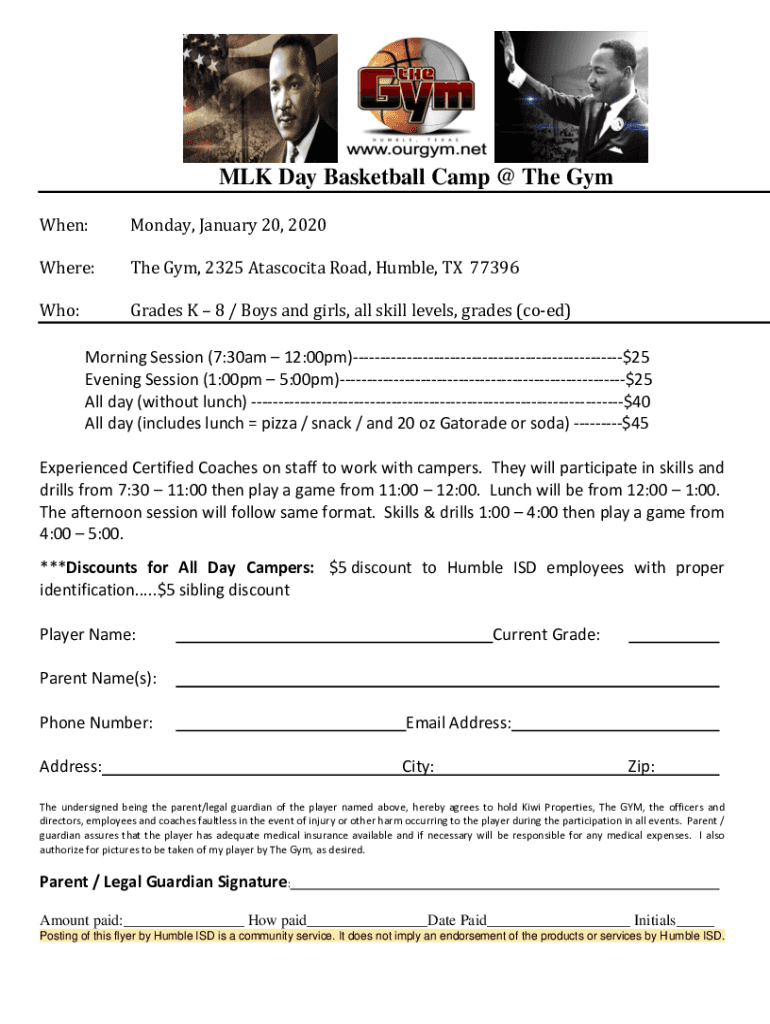 MLK Day Basketball Camp @ The Gym When:Monday, January 20, 2020Where:The Gym, 2325 Atascocita Road, Humble, TX 77396Who:Grades K 8 / Boys and girls, all skill levels, grades (coed) Morning Session