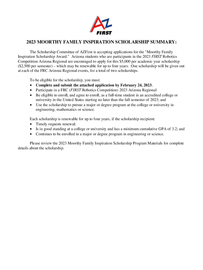 2023 WORTHY FAMILY INSPIRATION SCHOLARSHIP SUMMARY: The Scholarship Committee of First is accepting applications for the \” Moor thy Family Inspiration Scholarship Award.\” Arizona students who