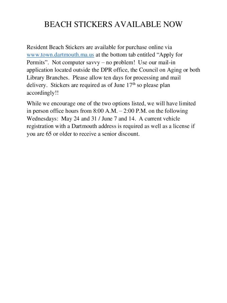 BEACH STICKERS AVAILABLE NOW Resident Beach Stickers are available for purchase online via www.town.dartmouth.ma.us at the bottom tab entitled Apply for Permits. Not computer savvy no problem! Use