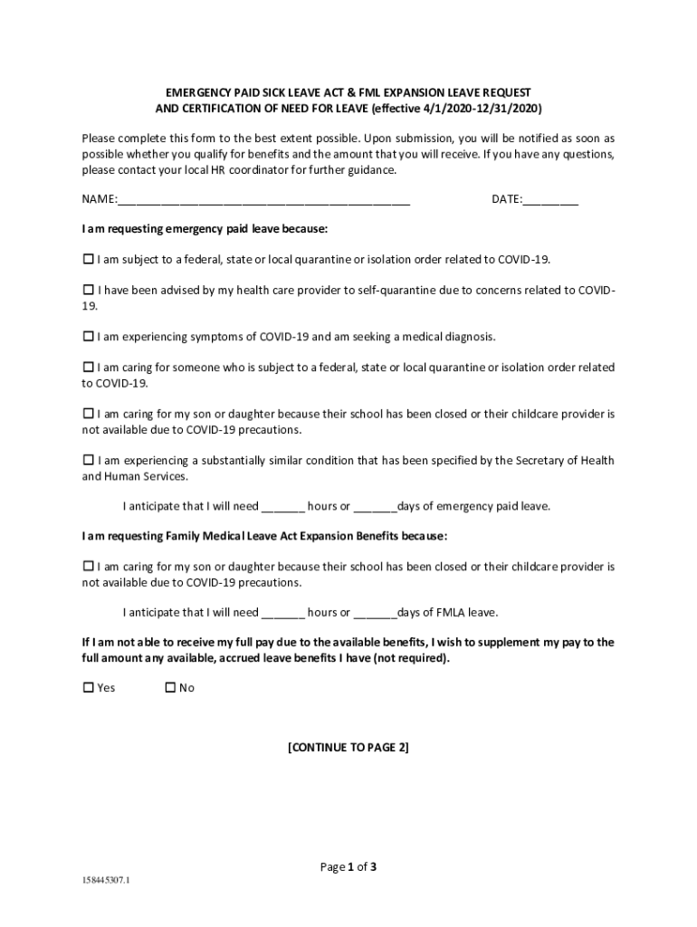 EMERGENCY PAID SICK LEAVE ACT & FM EXPANSION LEAVE REQUEST AND CERTIFICATION OF NEED FOR LEAVE (effective 4/1/202012/31/2020) Please complete this form to the best extent possible. Upon submission,