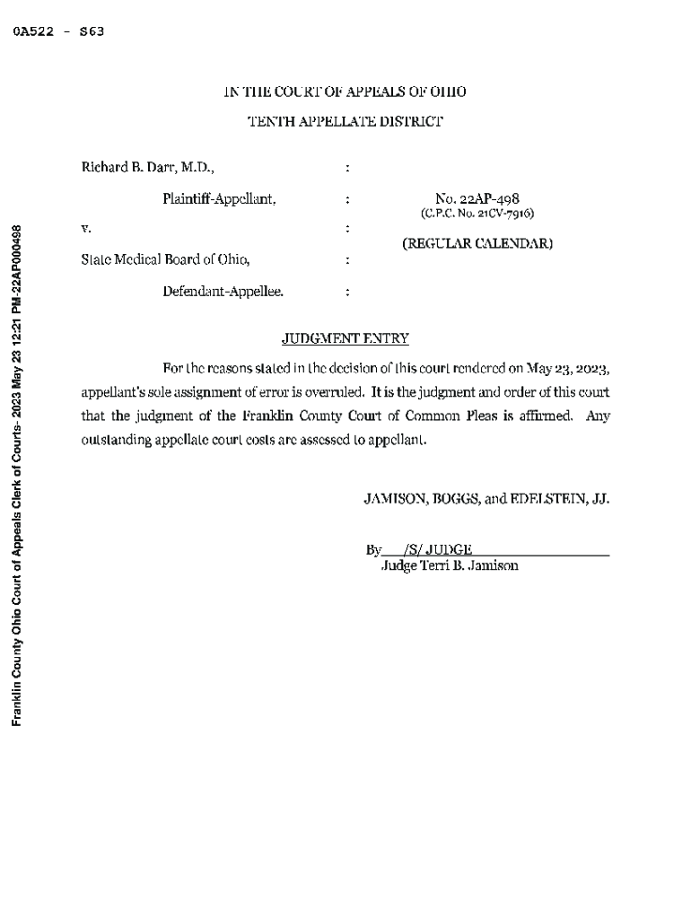 Franklin County Ohio Clerk of Courts of the Common Pleas 2022 Jul 14 10:55 AM21CV007916IN THE COURT OF COMMON PLEAS, FRANKLIN COUNTY, OHIORICHARD B. DARK, M.D., Appellant vs. STATE MEDICAL BOARD OF