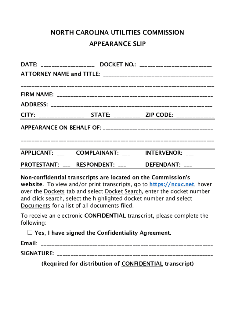 NORTH CAROLINA UTILITIES COMMISSION APPEARANCE SLIP DATE: ___ DOCKET NO.: ___ ATTORNEY NAME and TITLE: ___ ___ FIRM NAME: ___ ADDRESS: ___ CITY: ___STATE: ___ ZIP CODE: ___APPEARANCE ON BEHALF OF: