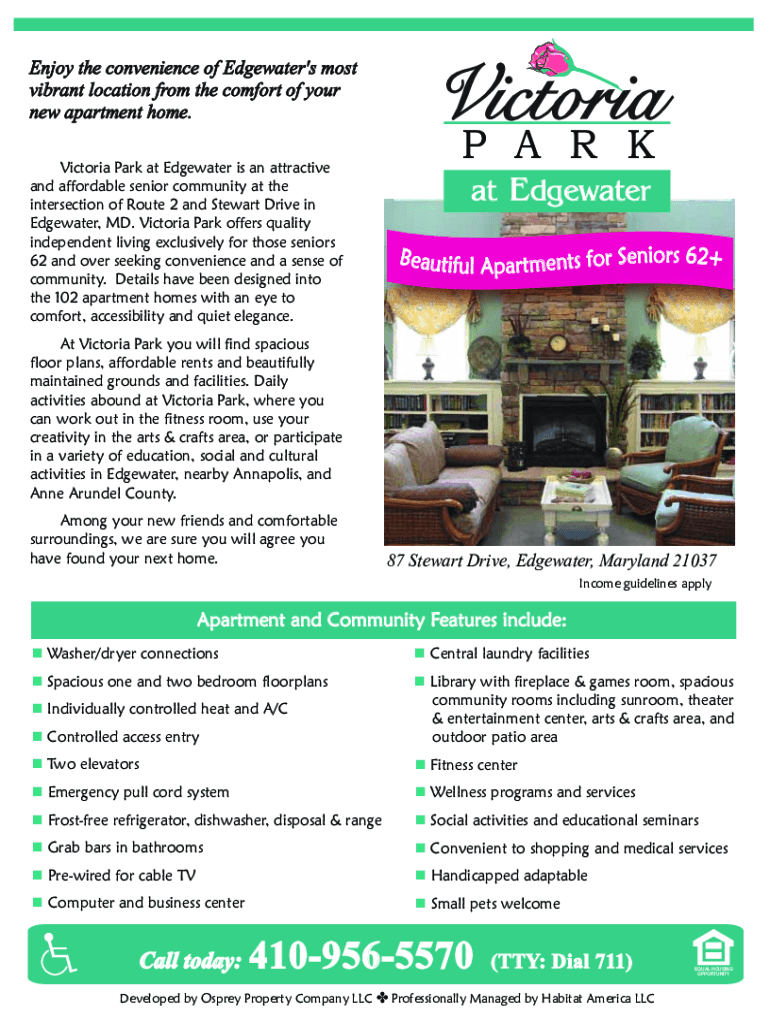 Enjoy the convenience of Edgewater\'s the most vibrant location from the comfort of your new apartment home. Victoria Park at Edgewater is an attractive and affordable senior community at the intersection