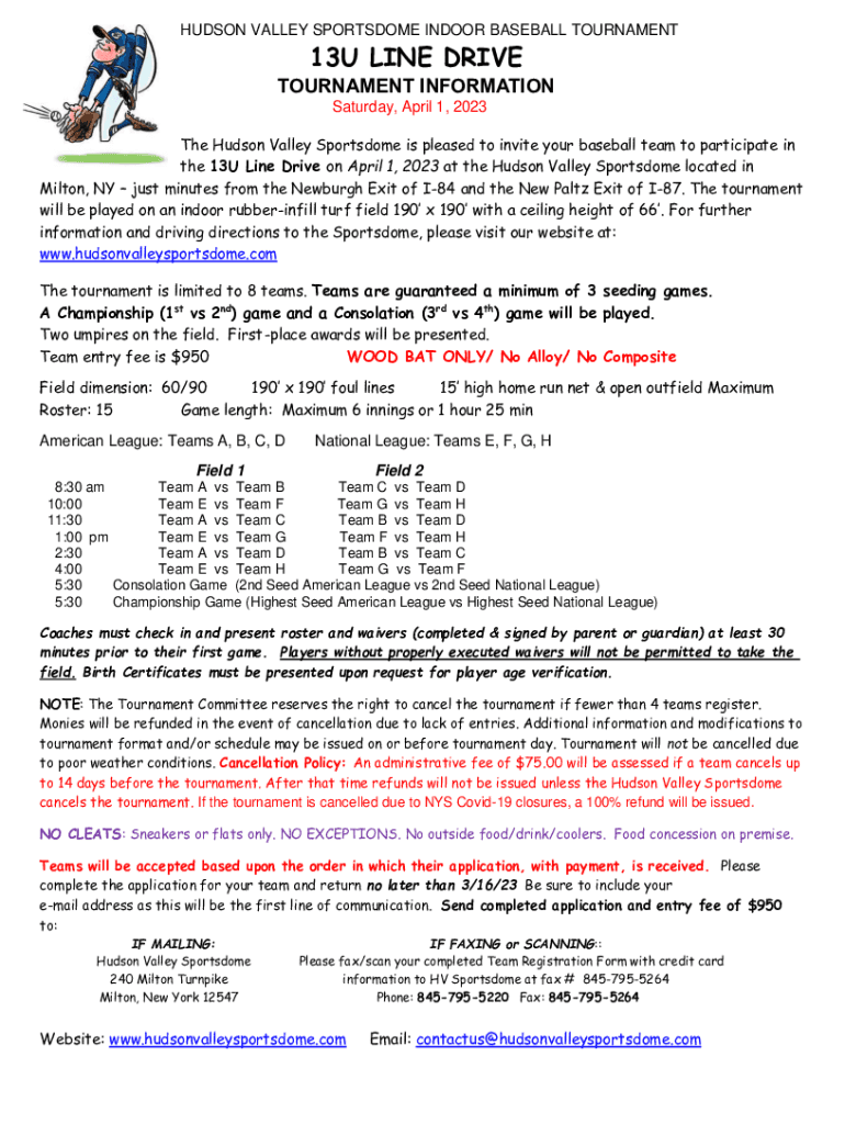HUDSON VALLEY SPORTSWOMEN INDOOR BASEBALL TOURNAMENT13U LINE DRIVETOURNAMENT INFORMATION Saturday, April 1, 2023, The Hudson Valley Sports dome is pleased to invite your baseball team to participate