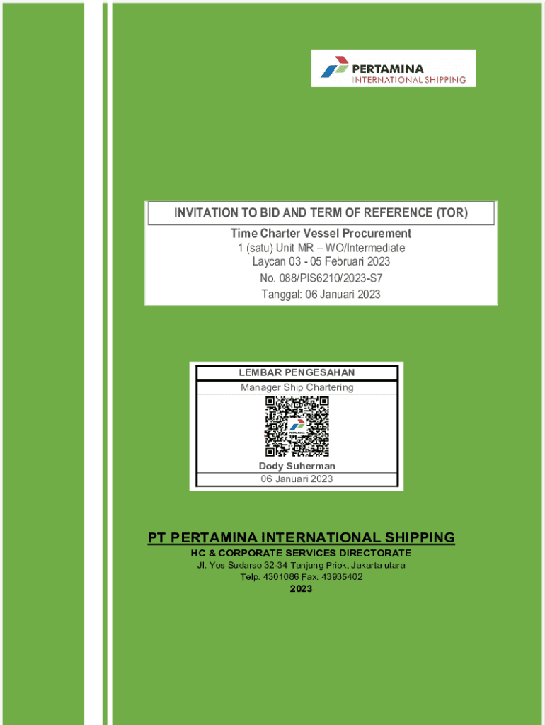 INVITATION TO BID AND TERM OF REFERENCE (TOR) Time Charter Vessel Procurement 1 (sat) Unit MR TO/Intermediate Layman 03 05 February 2023 No. 088/PIS6210/2023S7 Tang gal: 06 January 2023LEMBAR PENGESAHAN
