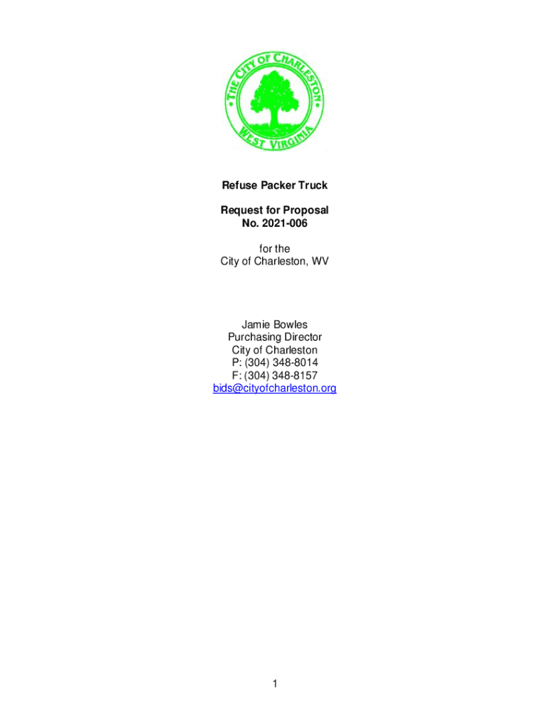 Refuse Packer Truck Request for Proposal No. 2021006 for the City of Charleston, WV Jamie Bowles Purchasing Director City of Charleston P: (304) 3488014 F: (304) 3488157 bids@cityofcharleston.org1Please