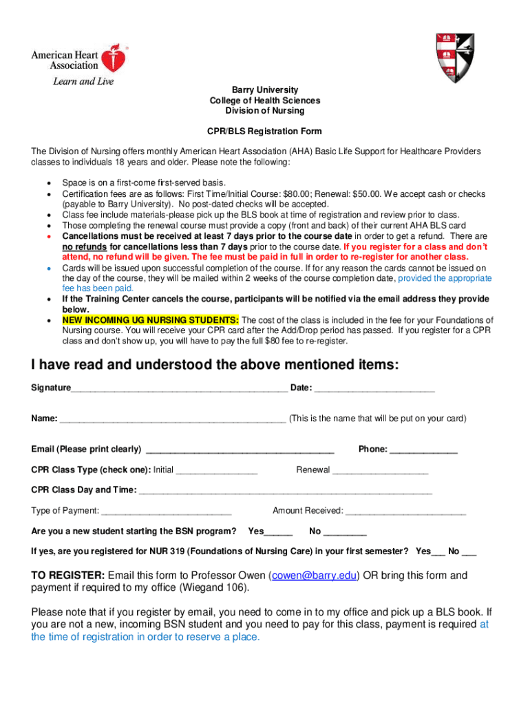 Barry University College of Health Sciences Division of Nursing CPR/BLS Registration Form The Division of Nursing offers monthly American Heart Association (AHA) Basic Life Support for Healthcare