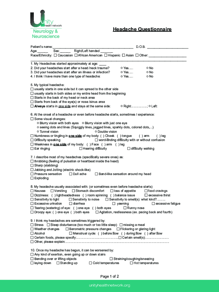 Headache Questionnaire Patients name:___ D.O.B. ___ Age:___ Sex:___ Right/Left handed ___ Caucasian African American Hispanic Asian Other: ___ Race/Ethnicity: ___ 1. My Headaches started approximately