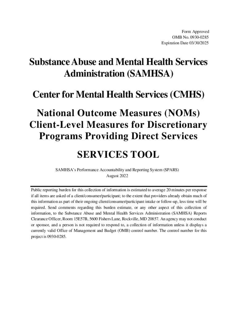 Form Approved OMB No. 09300285 Expiration Date 03/30/2025Substance Abuse and Mental Health Services Administration (SAMOSA) Center for Mental Health Services (CMOS) National Outcome Measures (Norms)