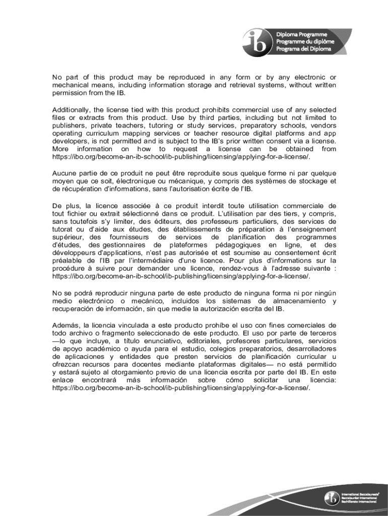 No part of this product may be reproduced in any form or by any electronic or mechanical means, including information storage and retrieval systems, without written permission from the IB. Additionally,