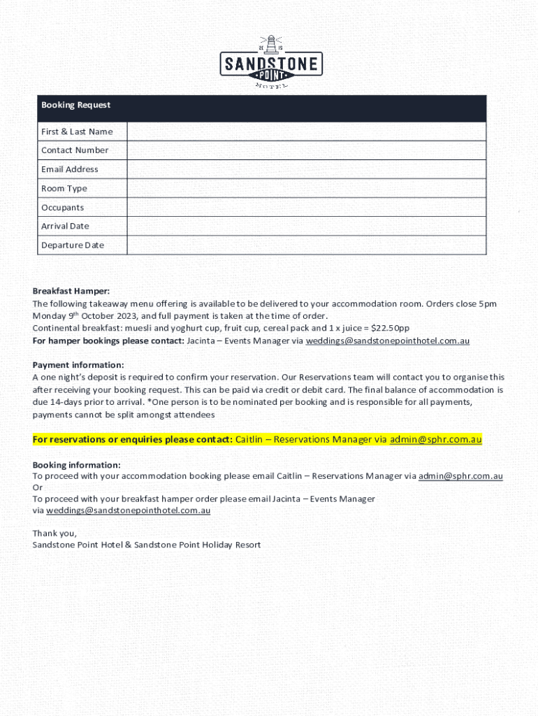 To fill out the Sandstone Point Hotel form, guests may need to provide their name, contact information, check-in and check-out dates, and any other requested details.