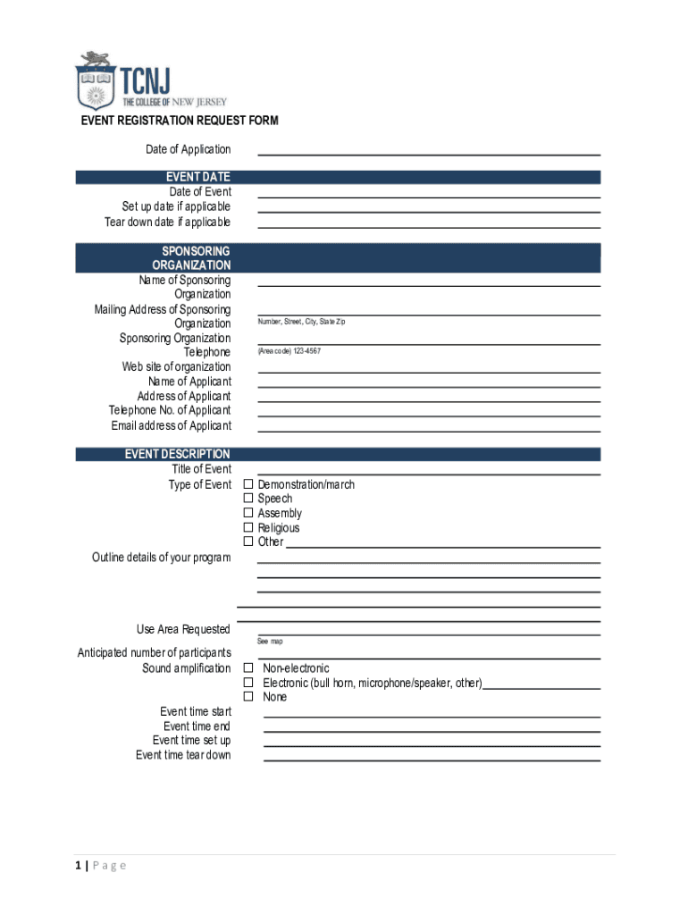 EVENT REGISTRATION REQUEST FORM Date of Application EVENT DATE of Event Set up date if applicable Tear down date if applicable SPONSORING ORGANIZATION Name of Sponsoring Organization Mailing Address