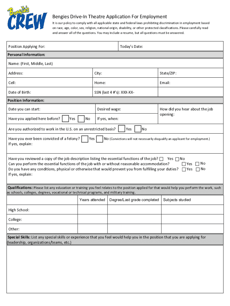 Begins Driven Theater Application For Employment It is our policy to comply with all applicable state and federal laws prohibiting discrimination in employment based on race, age, color, sex, religion,