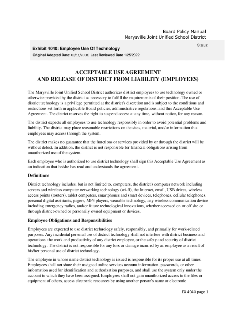 Board Policy Manual Marysville Joint Unified School District Exhibit 4040: Employee Use Of TechnologyStatus:Original Adopted Date: 03/11/2008 | Last Reviewed Date 1/25/2022ACCEPTABLE USE AGREEMENT