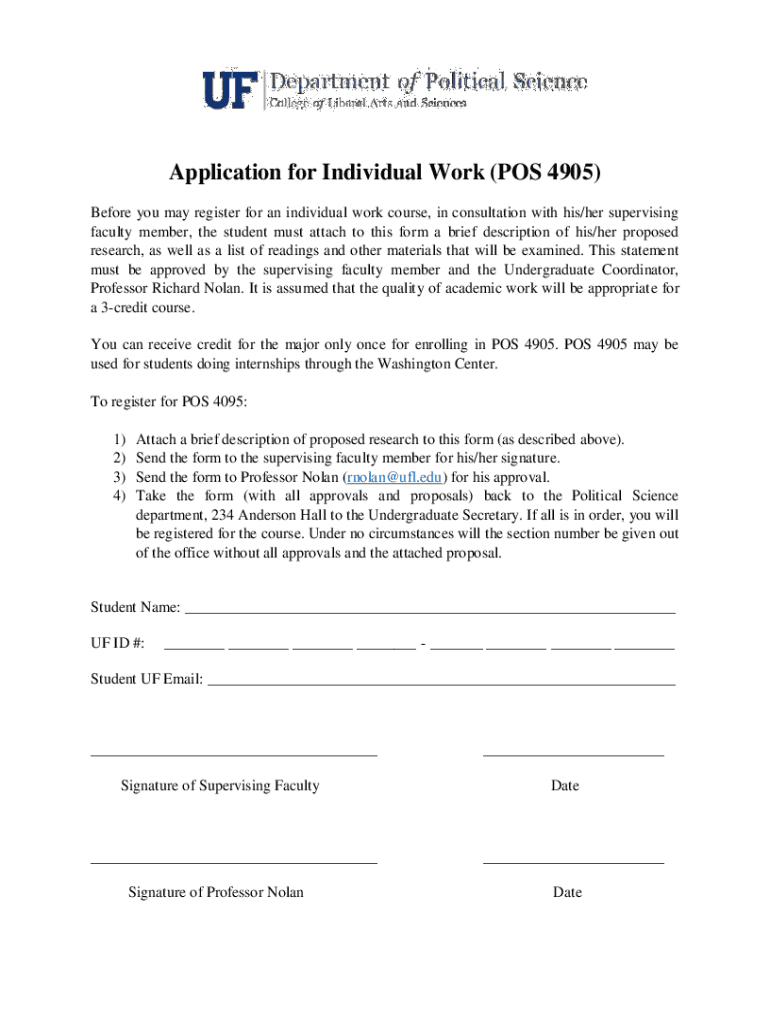 Application for Individual Work (POS 4905) Before you may register for an individual work course, in consultation with his/her supervising faculty member, the student must attach to this form a brief