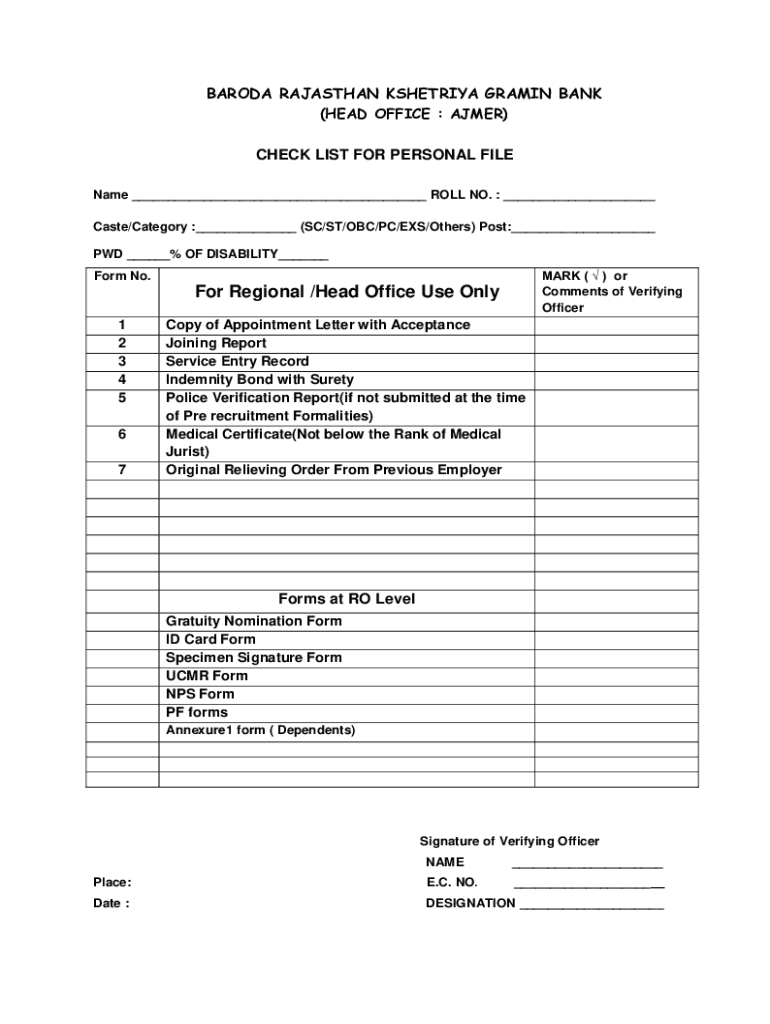 BARODA RAJASTHAN KSHATRIYA GRAIN BANK (HEAD OFFICE : AJMER) CHECK LIST FOR Personnel FILE Name ___ ROLL NO. ___ Caste/Category :___ (SC/ST/OBC/PC/EXS/Others) Post:___ PhD ___% OF DISABILITY___ MARK