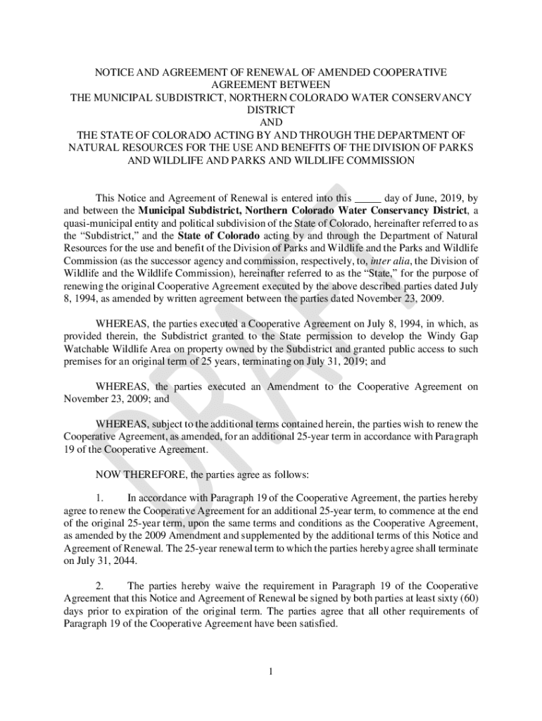 NOTICE AND AGREEMENT OF RENEWAL OF AMENDED COOPERATIVE AGREEMENT BETWEEN THE MUNICIPAL DISTRICT, NORTHERN COLORADO WATER CONSERVANCY DISTRICT AND THE STATE OF COLORADO ACTING BY AND THROUGH THE DEPARTMENT