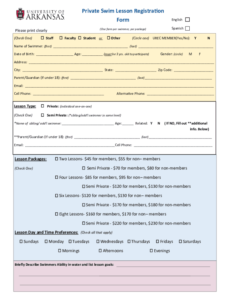 Private Swim Lesson Registration Form English(One form per swimmer, per package)SpanishPlease print clearly (Check One) Staff Faculty Student or Other(Circle one) REC MEMBER(Yes/No):Name of Swimmer: