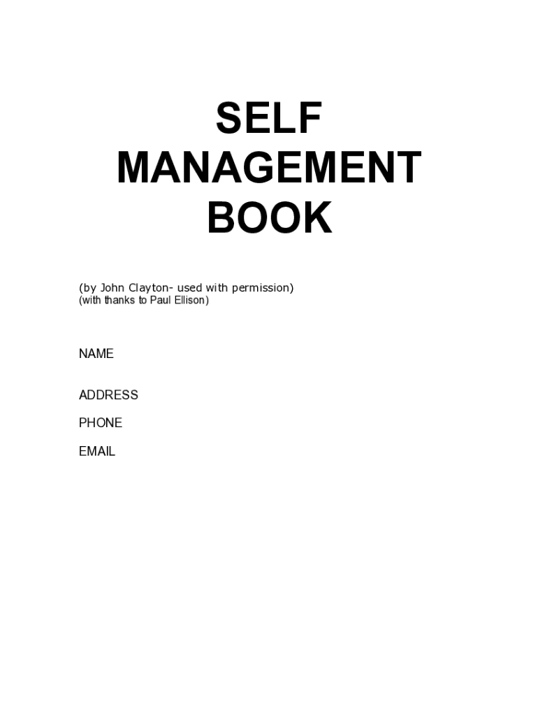 SELF MANAGEMENT BOOK (by John Clayton used with permission) (with thanks to Paul Ellison)NAME ADDRESS PHONE EMANATE___ PHONE___ EMAIL___ MONTUESWEDTHURSFRISATSUN.7:00___8:00___9:00 ___ 10:00 ___ 11:00___