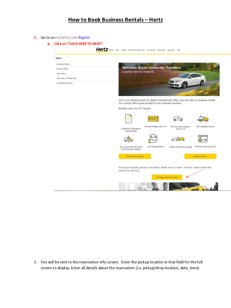 How to Book Business Rentals Hertz 1. Go to www.hertz.com/baylor a. Click on CLICK HERE TO RENT2. You will be sent to the reservation info screen. Enter the pickup location in that field for the full
