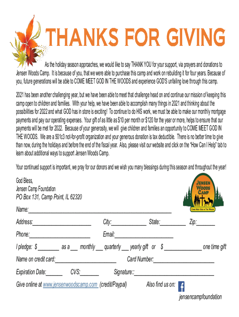 As the holiday season approaches, we would like to say THANK YOU for your support, via prayers and donations to Jensen Woods Camp. It is because of you, that we were able to purchase this camp and