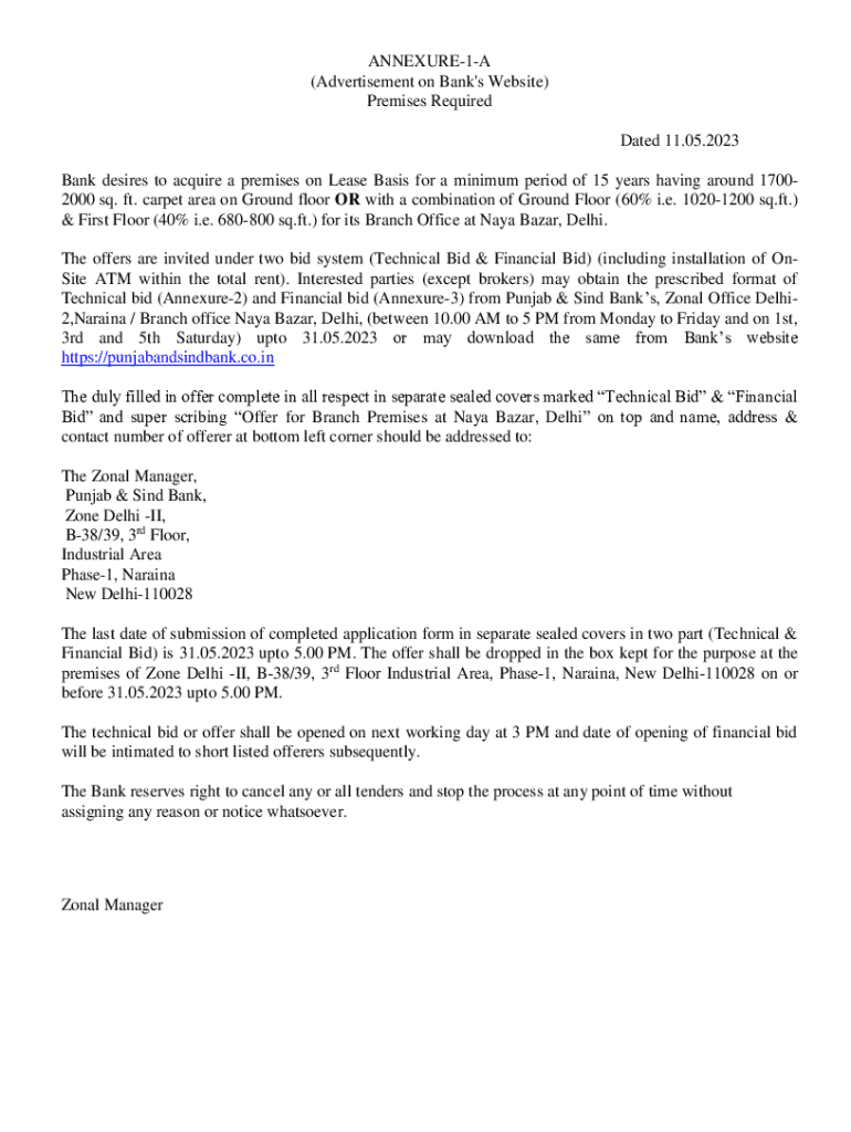 ANNEXURE1A (Advertisement on Bank\'s Website) Premises Required To be Dated 11.05.2023 Bank desires to acquire a premises on Lease Basis for a minimum period of 15 years having around 17002000 sq.