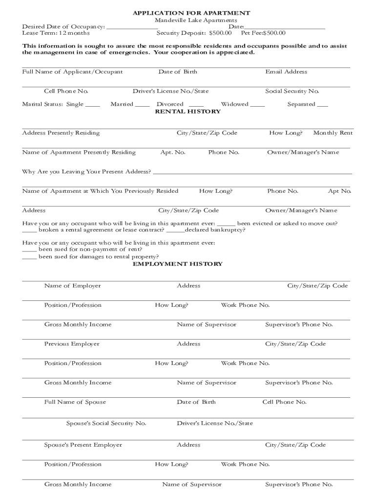 APPLICATION FOR APARTMENT Mandeville Lake Apartments Desired Date of Occupancy: ___Date:___ Lease Term: 12 monthsSecurity Deposit: $500.00 Pet Fee:$500.00This information is sought to assure the most