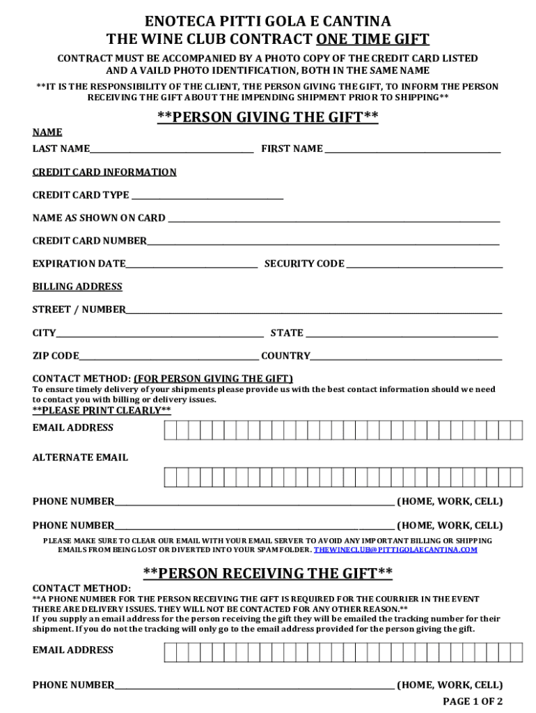 EXOTICA PITT GOLD E CANTING THE WINE CLUB CONTRACT ONE TIME GIFT CONTRACT MUST BE ACCOMPANIED BY A PHOTO COPY OF THE CREDIT CARD LISTED AND A SAID PHOTO IDENTIFICATION, BOTH IN THE SAME NAME **IT
