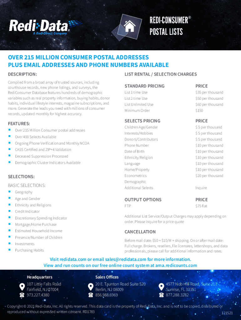 OVER 215 MILLION CONSUMER POSTAL ADDRESSES PLUS EMAIL ADDRESSES AND PHONE NUMBERS AVAILABLE DESCRIPTION:LIST RENTAL / SELECTION CHARGESCompiled from a broad array of trusted sources, including courthouse
