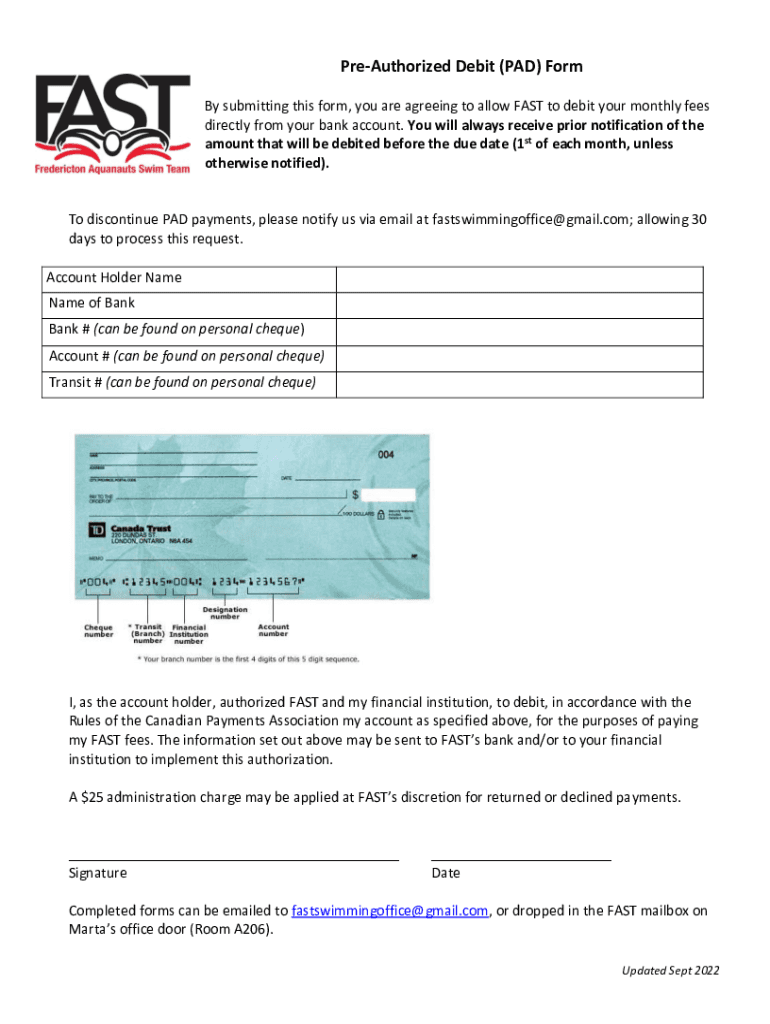 PreAuthorized Debit (PAD) Form By submitting this form, you are agreeing to allow FAST to debit your monthly fees directly from your bank account. You will always receive prior notification of the