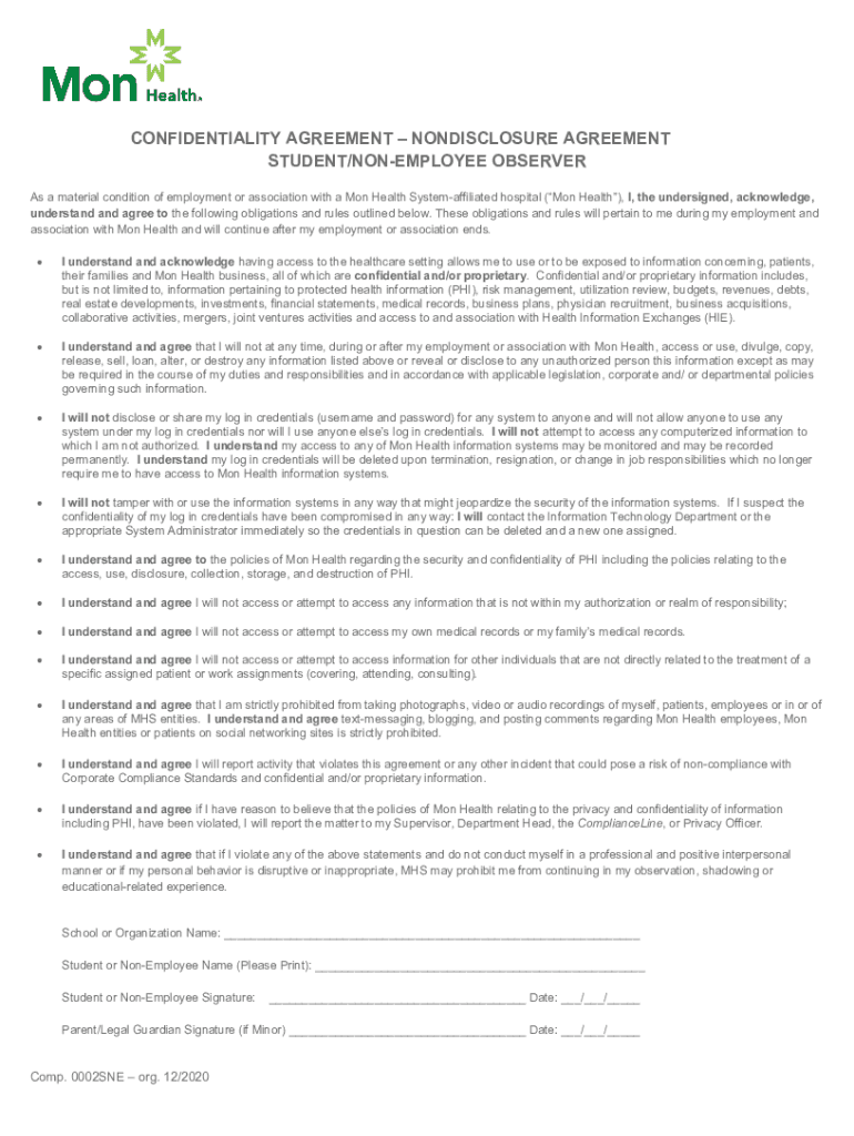 CONFIDENTIALITY AGREEMENT NONDISCLOSURE AGREEMENT STUDENT/EMPLOYEE OBSERVER As a material condition of employment or association with a Mon Health System affiliated hospital (Mon Health), I, the undersigned,