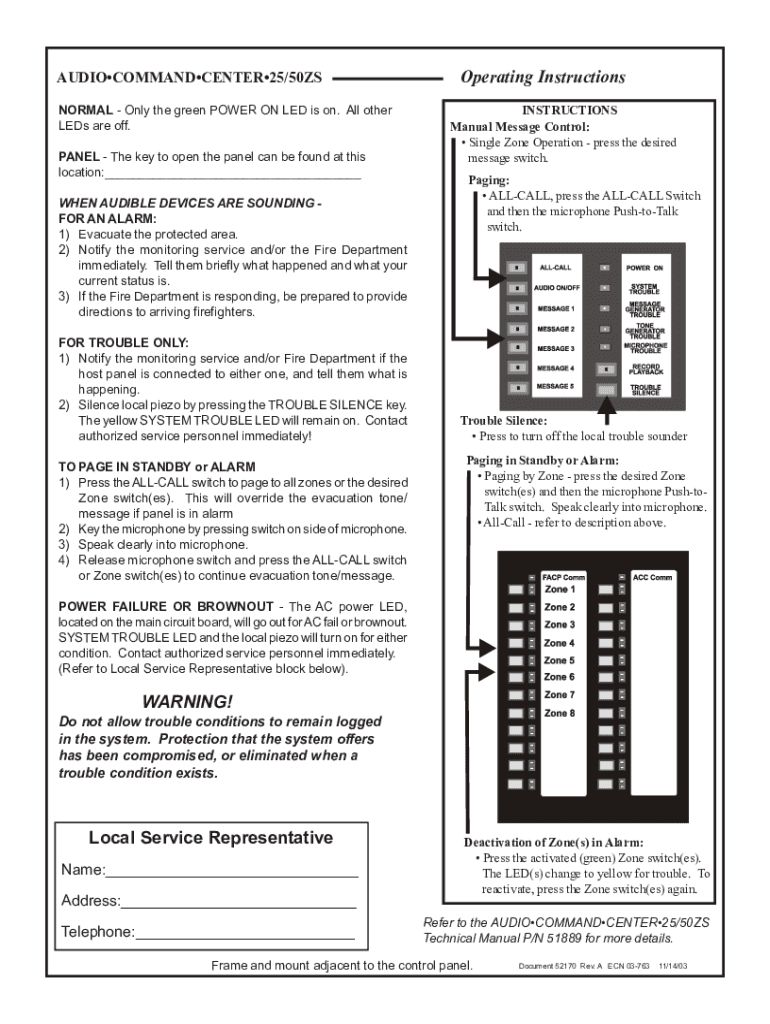 AUDIOCOMMANDCENTER25/50ZS NORMAL Only the green POWER ON LED is on. All other LEDs are off. PANEL The key to open the panel can be found at this location:___ WHEN AUDIBLE DEVICES ARE SOUNDING FOR