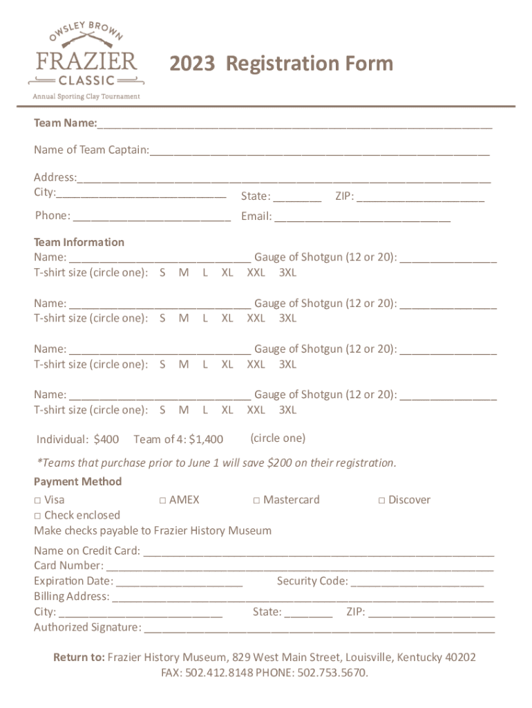 2023 Registration Form Team Name:___ Name of Team Captain:___Address:___ City:___ State: ___ ZIP: ___ Phone: ___ Email: ___ Team Information Name: ___ Gauge of Shotgun (12 or 20): ___ Shirt size (circle
