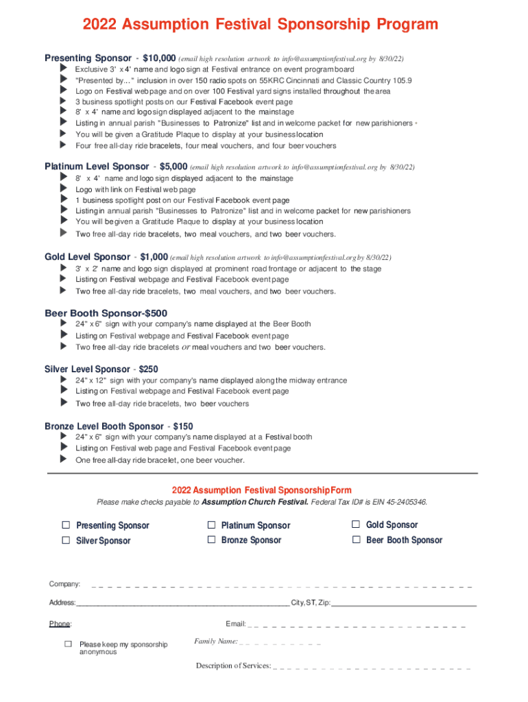 2022 Assumption Festival Sponsorship Program Presenting Sponsor $10,000 (email high resolution artwork to info@assumptionfestival.org by 8/30/22) Exclusive 3\' x 4\' name and logo sign at Festival