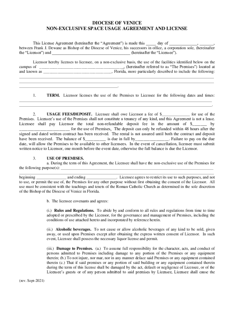 DIOCESE OF VENICE NONEXCLUSIVE SPACE USAGE AGREEMENT AND LICENSE This License Agreement (hereinafter the Agreement) is made this ___ day of ___, ___, between Frank J. Dewayne as Bishop of the Diocese