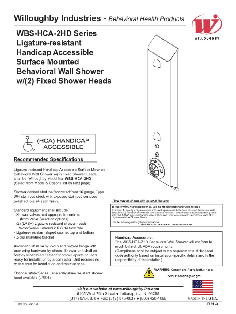 Willougbhy Industries Behavioral Health Products :%6+&$+\'6HULHV Ligature resistant +DQGLFDS$FFHVVLEOH Surface Mounted Behavioral Wall Shower Z)L[HG6KRZHU+HDGV5HFRPPHQGHG6SHFLFDWLRQV Ligature resistant
