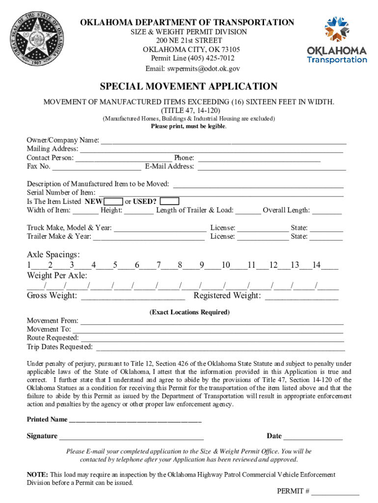 OKLAHOMA DEPARTMENT OF TRANSPORTATION SIZE & WEIGHT PERMIT DIVISION 200 NE 21st STREET OKLAHOMA CITY, OK 73105 Permit Line (405) 4257012 Email: swpermits@odot.ok.govSPECIAL MOVEMENT APPLICATION MOVEMENT