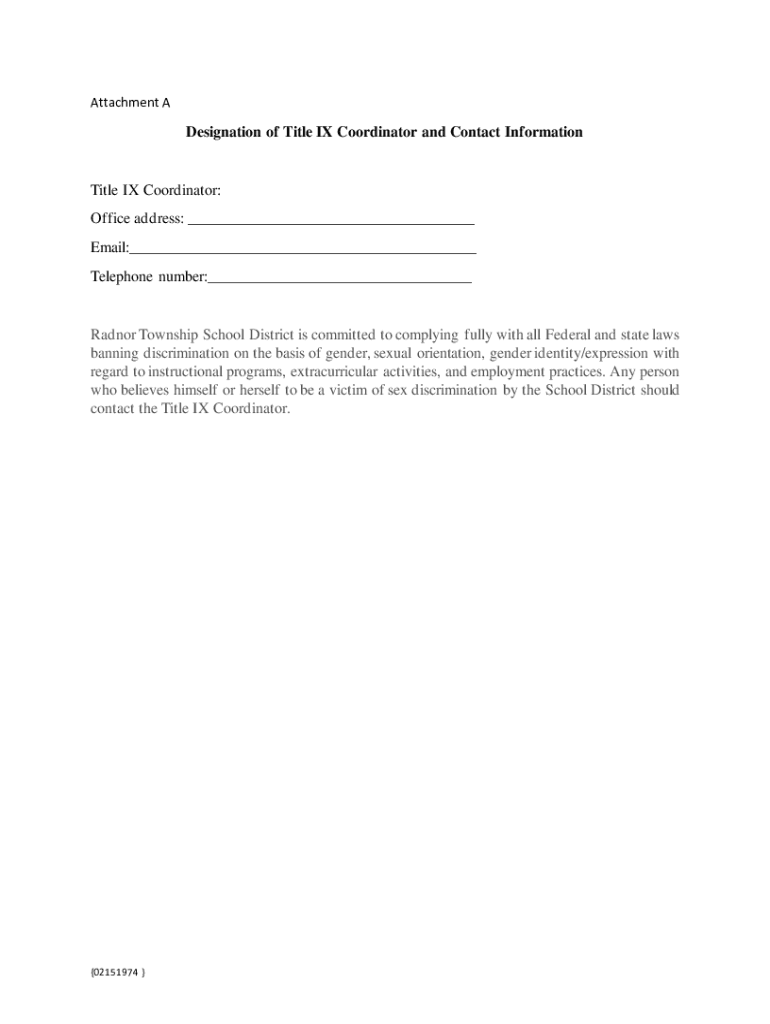 Attachment Designation of Title IX Coordinator and Contact InformationTitle IX Coordinator: Office address: ___ Email:___ Telephone number:___Rad nor Township School District is committed to complying